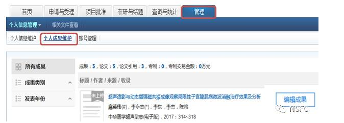 建议项目负责人先通过“管理”菜单中的“个人成果维护”功能将本人的成果信息进行录入或从第三方导入,以备今后的进展、结题、申请等进行直接引用。