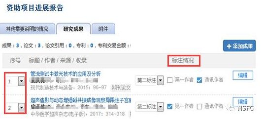 进展报告中的期刊论文与会议论文类成果需要选择本基金项目资助号是第几标注。通过页面上的序号列可调整成果在报告中的排序。