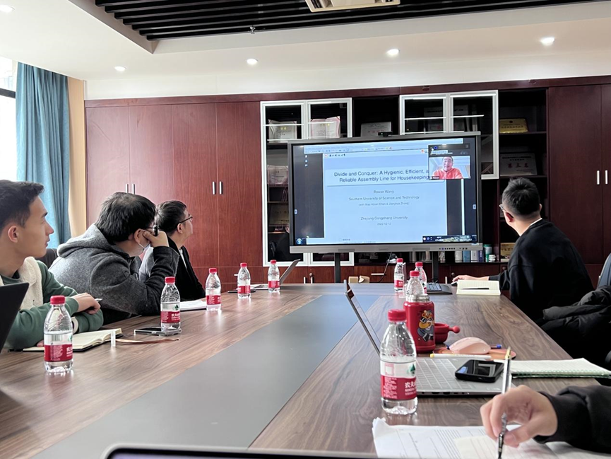2022年12月12日下午,南方科技大学王宇教授应邀在腾讯会议(ID:791-504-601)开展了一场题为“Divide and Conquer: A Hygienic,Efficient, and Reliable Assembly Line for Housekeeping(流水线式客房清洁流程设计)”的学术讲座。本次讲座采用线上线下相结合的方式,线下讲座在综合楼615会议室举行,由亚洲博彩平台排名 张崇辉教授主持,亚洲博彩平台排名 部分老师和研究生参加了此次讲座。