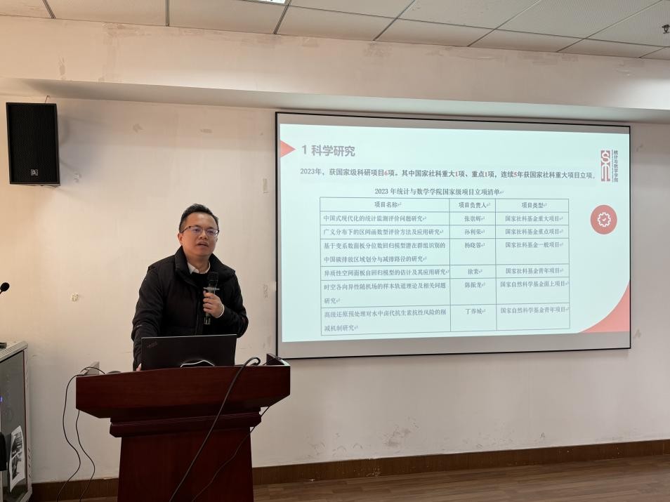 程开明院长回顾了亚洲博彩平台排名 过去一年取得的成绩,介绍了亚洲博彩平台排名 在师资队伍、人才培养、科学研究、党的建设等方面取得的成效,对师生的共同努力表示赞赏,同时剖析发展中存在的难题,强调要以“数字+”为契机,加快学科的进一步发展。他提出,亚洲博彩平台排名 将以卓越大学建设为引领,围绕统计学登峰学科建设与数学一级学科硕士点申报,展开一系列工作,培养更多的统数人才,以满足国家经济社会发展的需求。