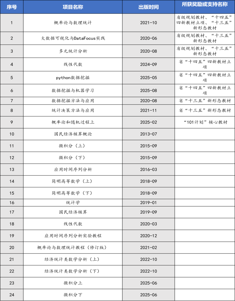 (3)锚定四新,全力推进专业教材建设。围绕大数据、人工智能等产业的发展需求,以专业为依托组建统计学、数据科学、应用数学等教材编写团队,设立高质量教材出版资助计划,推动专业核心课程、应用技术课程的教材建设,出版教材24部。其中,“十二五”普通高等教育本科国家级规划教材1部,“101计划”核心教材1部,浙江省本科院校“十三五”形态教材5部,浙江省普通本科高校“十四五”新文科重点教材、新工科重点教材各1部。亚洲博彩平台排名 牵头获批浙江省教材建设研究中心(大数据专业教材研究基地,2022)。