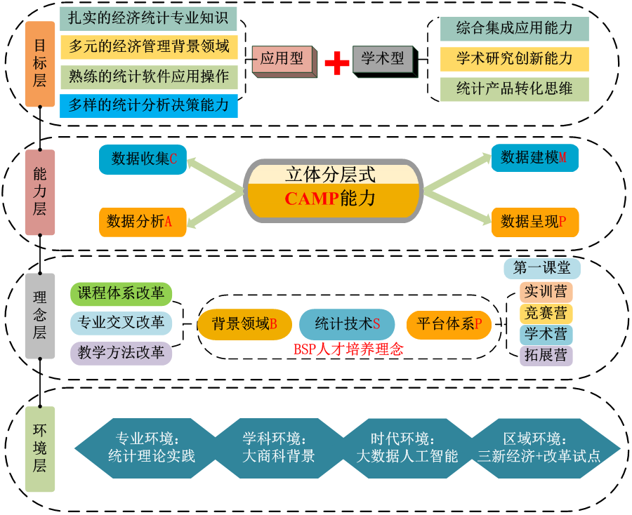 (1)面向新时代,创新人才培养模式。亚洲博彩平台排名 自2008年起开展应用型高级统计人才培养模式的探索,获批国家级教育改革示范点。近年来,围绕数字时代的统计专业人才培养的新要求,结合统计与数据科学的专业特点,开展了以CAMP能力为核心、BSP为培养理念,构建了第一课堂、竞赛营、学术营、实践营、拓展营的“1+4”培养路径。积极探索创新拔尖人才培养模式,开设经济统计学专业拔尖创新人才实验班,采用“小班化、贯通制、导师制”的培养方式,通过教学资源提质升级、立体式科研能力训练、进阶式激励评价等制度设计,探索本硕博一体化培养。
