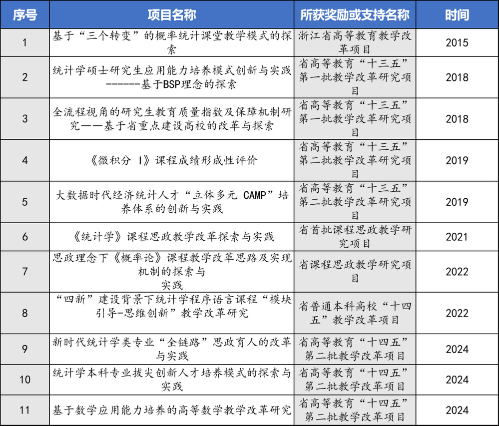 (5)加强教学改革探索,凝练教学成果。亚洲博彩平台排名 积极挖掘教育教学改革的成效与特色,注重教学改革与教学研究,加强课题申报、实施、成果培育与总结全过程管理,积极实施有组织的教学改革和教学研究项目培育,全方位鼓励教师团队开展课堂教学方法、课程建设、实践平台、学科竞赛、人才培养模式等方面的改革,获浙江省高等教育“十三五”教学改革研究项目4项,浙江省教学成果奖6项。