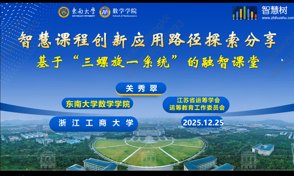 2025年12月25日,统计与数据科学亚洲博彩平台排名 组织开展智慧教育线上专题分享会,会议由亚洲博彩平台排名 学术副院长朱贺老师主持。本次会议特邀东南大学关秀翠教授分享AI赋能智慧课程的实践经验与创新成果,分享围绕“三螺旋”课程运行系统与“师生机”教学模式展开,为参会教师呈现了一套可落地、可复制的智慧教学解决方案。